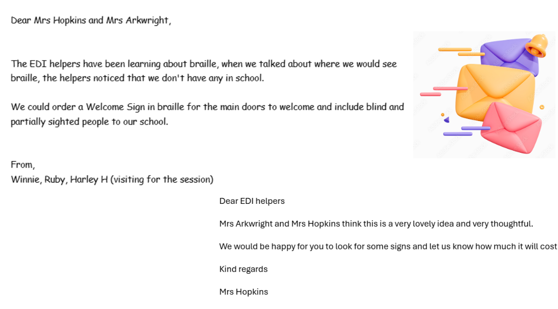 The group noticed that our school doesn’t currently have any Braille signage and suggested we change that. Together, we wrote an email to Mrs Arkwright and Mrs Hopkins asking if Braille signs could be added at the school entrance to make everyone feel welcome.