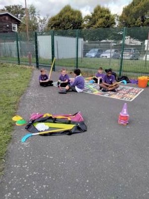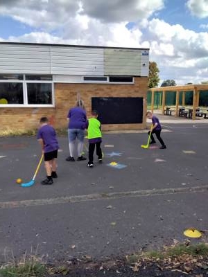 At playtimes and golden times pupils are encouraged to participate in physical activities and our outdoor environment has been carefully planned out to include these opportunities. Our outdoor equipment includes: a climbing frame, two swings, two trampolines, trim trail, outdoor gym, trim trail, monkey bars and actival. Pupils also have access to bikes, scooters and other equipment such as skipping ropes, balls and hoops. Midday supervisors carefully select the equipment and activities that are used at lunchtimes to encourage physical activity and ensure rotation over the week. Team games such as football are equally encouraged and carefully monitored by staff to ensure rules are followed and skills of team work and sportsmanship evident.